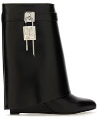 Go to VITKACBlack smooth leather wedge boots from Givenchy. Wedge covered by shoe upper. Running around signature shark tooth fastening strap in upper part. Outer Layer: Calf Leather. Inner Layer: Suede, Leather. Other Elements: Metal.