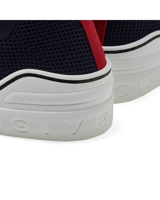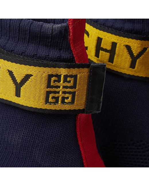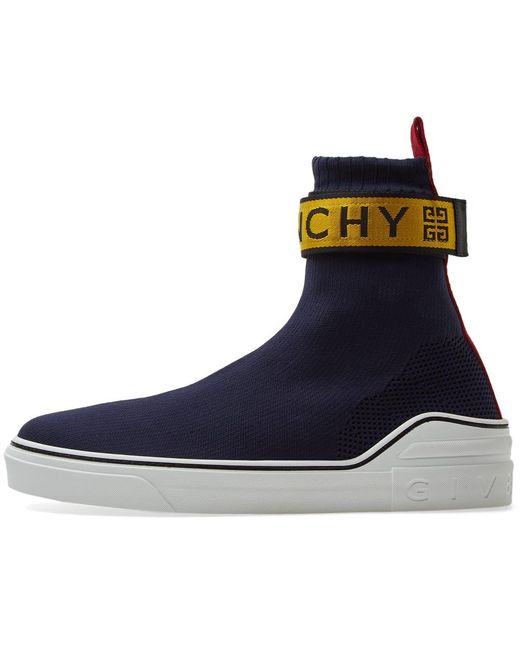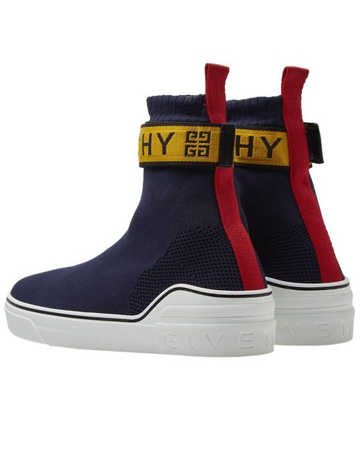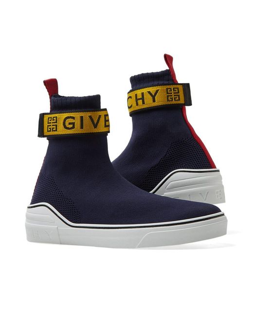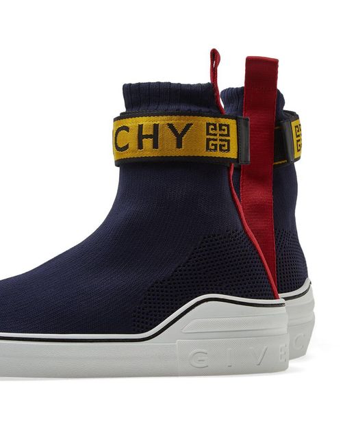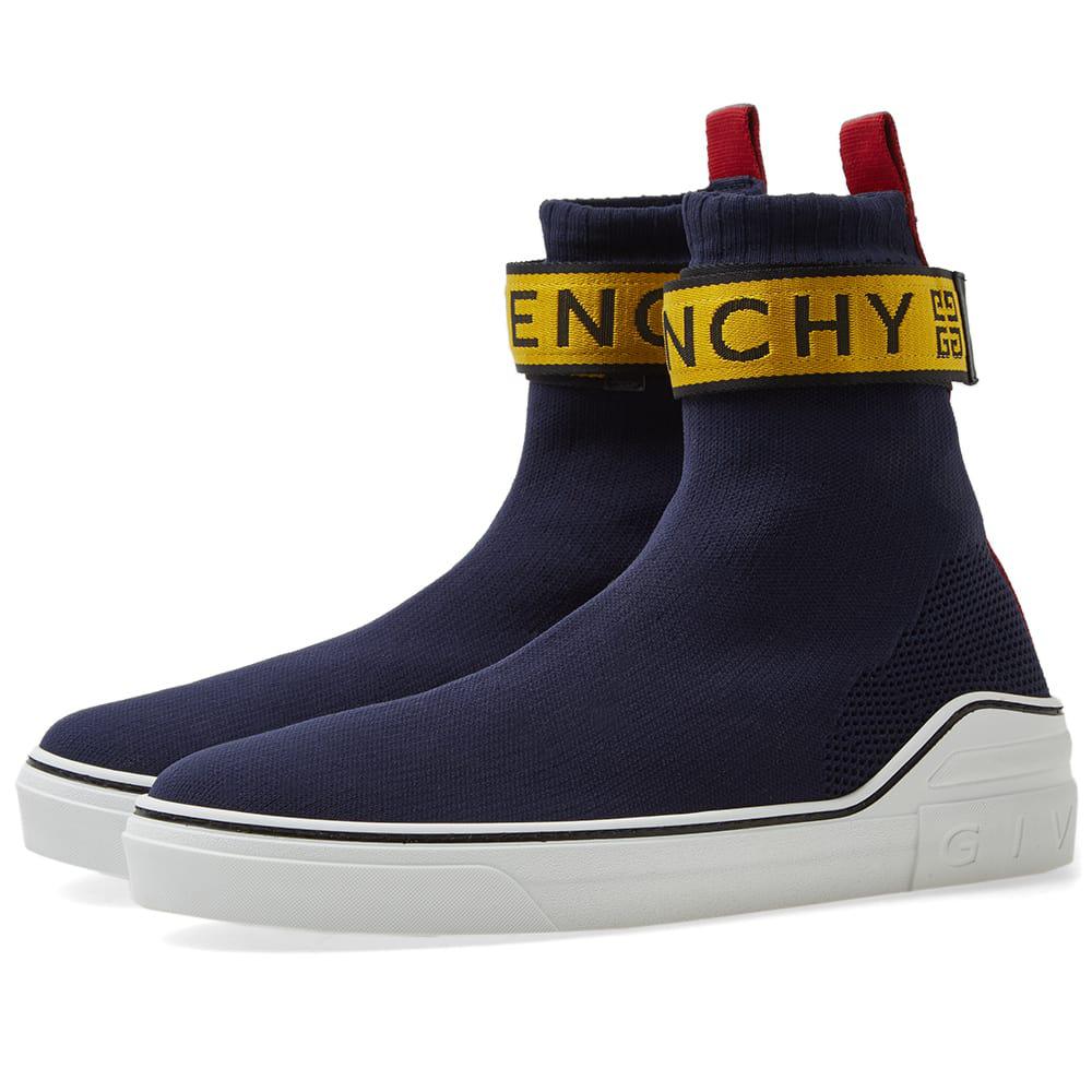 Cut with a sock-like fit, Givenchy's George V high-top sneakers are constructed of navy mixed knit. Showcasing athletic-inspired styling, this pair is appliquéd with a yellow and red nylon logo-detailed hook-and-loop ankle strap. 1/25mm midsole (approximately). Rounded toe. Rib-knit topline. Hook-and-loop ankle strap. Red webbed fabric pull tab at back. Logo-debossed white midsole. Pulls on. Hook-and-loop ankle closure. Rubber sole. Made in Italy. Givenchy Men's George V Knit Sneakers - Navy Size 6 M A great designer gift. Shop Givenchy at Barneys New York.