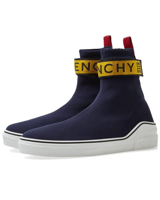 In reference to its regal title, Givenchy's George V strap trainer is sure to reign over the streetwear scene with its impressionable navy and hazardous yellow colourway. The sock-like construction has been crafted with flexible knitted uppers, featuring a striking wrap around ankle strap and lower mesh panels for ventilation; complete with a grosgrain heel tab, this premium pair ride high atop of a vulcanised rubber outsole this season. Knit Uppers. Sock-Like Construction. Ribbed Cuffs. Velcro Ankle Straps. Engineered Branding. Mesh Panels. Heel Pull Tab. Debossed Branding. Vulcanised Rubber Outsole. Made in Italy. Colour: blue