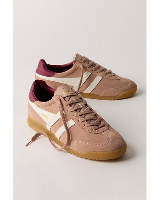 Tapered to perfection, these slim, sporty trainers from Gola feature contrast striping and a gum rubber outsole. **Features:** Low-top style, leather uppers, suede overlays, contrast stripes and heel tab, gum rubber outsole with toothed tread, lace-up closure **Why We Gola Torpedo Trainers Shoe at Free People in Cameo/Off White/Cerise, Size: US 7 Colour: brown