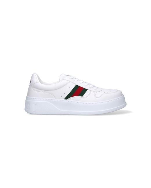 Gucci white calf leather Chunky B trainers with round toe, laces, two-tone "Web" ribbon detail on the side, logo tag on the front tongue, logo lettering tab on the back, and rubber sole. - Sole: 100% rubber Colour: white
