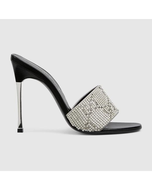 Introducing Spring Summer 2026. This style is featured in "La Bomba N.2" and "La Drama Queen" looks of La Famiglia. Defined by a stiletto heel in silver-toned finish, the evening style is crafted from GG crystal mesh on a silk satin base, and complements the ready-to-wear narrative with a sparkling touch. Grey GG crystal mesh, Black leather lining and insole, Round toe, Black leather sole, Silver-toned steel stiletto heel, High heel, Height: 110mm, Made in Italy