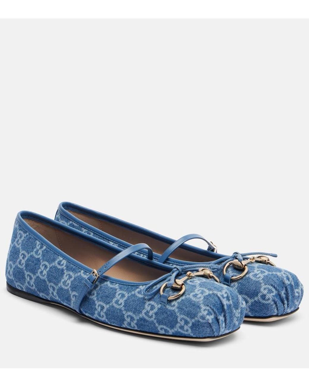 Gg Denim Ballet Flats With Horsebit Detail - Blue