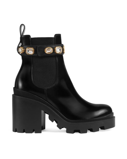 The ankle boot in shiny black leather is designed with a lug sole and elastic inserts on each side for a pull-on entry. Completed with a detachable ankle strap dotted with sparkling crystals encased within engraved trims, resembling vintage jewels. The emblematic Double G finishes the front. Black leather. Detachable ankle belt with crystals and Double G. 2.75" heel height with. 8" platform, total height 3.5". 5.5" shaft height. Made in Italy. Material:Rubber/Leather/Crystal.