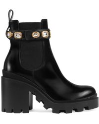 The ankle boot in shiny black leather is designed with a lug sole and elastic inserts on each side for a pull-on entry. Completed with a detachable ankle strap dotted with sparkling crystals encased within engraved trims, resembling vintage jewels. The emblematic double g finishes the front. Black leather. Detachable ankle belt with crystals and double g. 6cm heel height with 2cm platform. 14cm shaft height. Made in italy. Leather. Colour: black