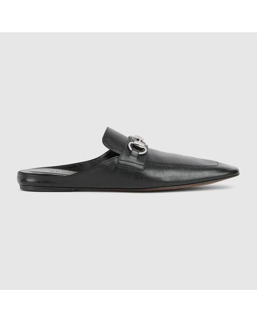 Generation Gucci delves into the brand's archival codes, and combines different generations of design into one aesthetic narrative. This mule puts an edgy twist on the classic Horsebit loafer, defined by a square toe, flat sole and reverse construction, a refined shoemaking method that turns the upper inside‑out to create a glove‑like interior for a soft, comfortable and flexible fit. Black leather, Silver-toned hardware, Black leather lining, Horsebit, Square toe, Reverse construction, Padded i Colour: black