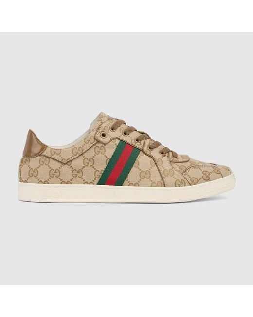 Generation Gucci delves into the brand's archival codes, and combines different generations of design into one aesthetic narrative. The Stretch reimagines the House's signature trainer in a light, soft and flexible silhouette. Crafted from GG canvas, this style is embellished with leather details for a refined touch. Sand and dark brown GG canvas, Brown leather piping and back tab, Silver-toned hardware, Leather lining, Web detail on the side, Interlocking G metal detail on the tip of the toe an Colour: natural