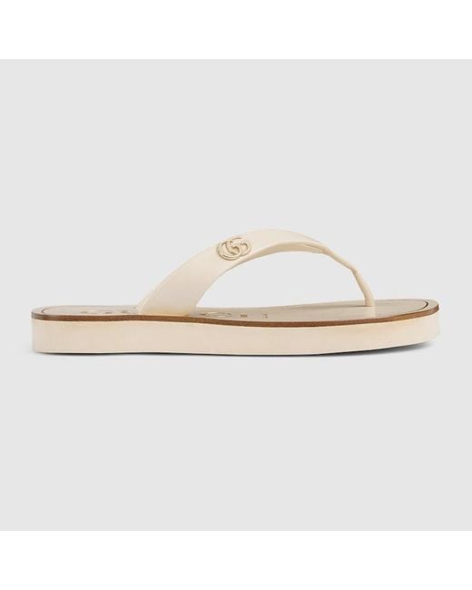 Emblematic codes of the House are reinterpreted in contemporary ways. Crafted in leather, this thong sandal is elevated with a Double G hardware in light gold-toned finish and logo detail on the smooth leather insole. Ivory leather, Light gold-toned hardware, Leather lining, Double G detail, Rubber sole, Leather insole with Gucci logo, Flat Colour: white