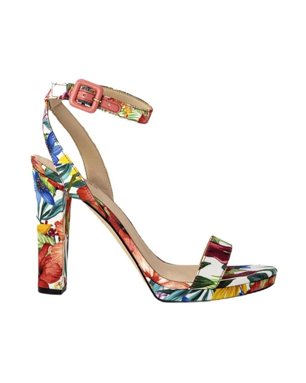 Elevate your Spring/Summer style with Guess Floral Buckle Bow Block Heel Sandals. Featuring a charming floral pattern on a white base, these sandals add elegance to any outfit. The secure buckle and delicate bow detail enhance the design. With a block heel and round toe, these sandals offer both comfort and style for any occasion.