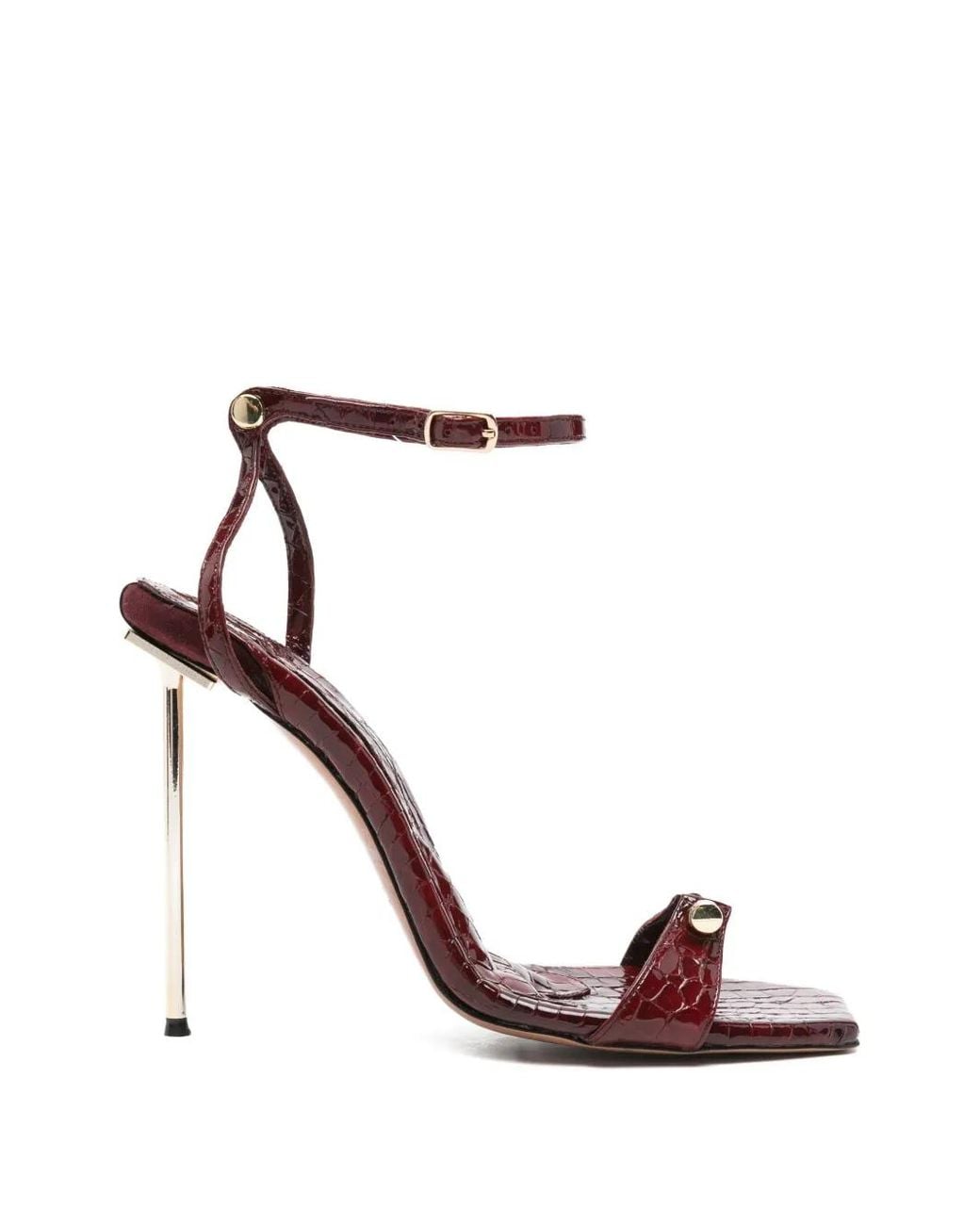 Burgundy croc-effect texture patent finish square open toe buckle-fastening ankle strap gold-tone hardware stiletto heel branded leather footbed Size: 35. Gender: Female. Material:Calf Leather/Calf Leather/Calf Leather. Colour: red
