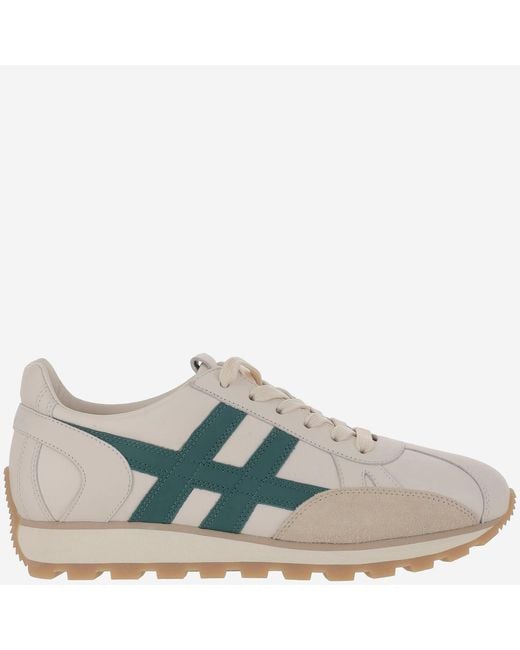 Sneakers made of leather Round toe Lace-up front Side logo band Reinforcement on heel Extralight sole with cleats White, green Made in Italy Composition: 100% leather