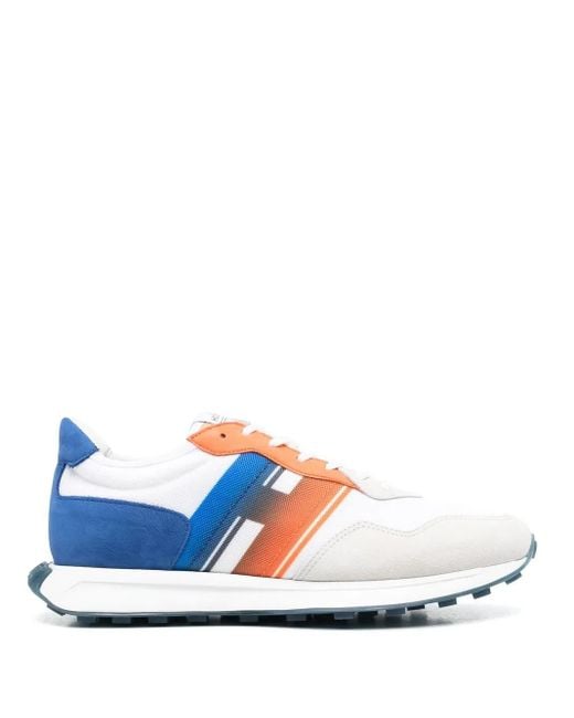 White/royal blue/tangerine orange calf leather suede panels logo patch to the side gradient effect contrasting heel counter front lace-up fastening almond toe branded insole memory foam insole flat rubber sole Size: 5. Gender: Male. Material:Calf Leather/Fabric/Calf Suede/Fabric/Rubber.
