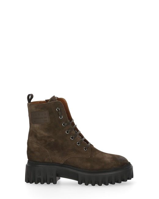 - Hogan brown woman's suede leather boots - Round toe - Logoed tongue - Front laces fastening - Side zip fastening - Side logoed patch - Raised rubber sole (7,6 cm)Composition: 100% Cowhide Sole:, 100% Rubber Colour: brown