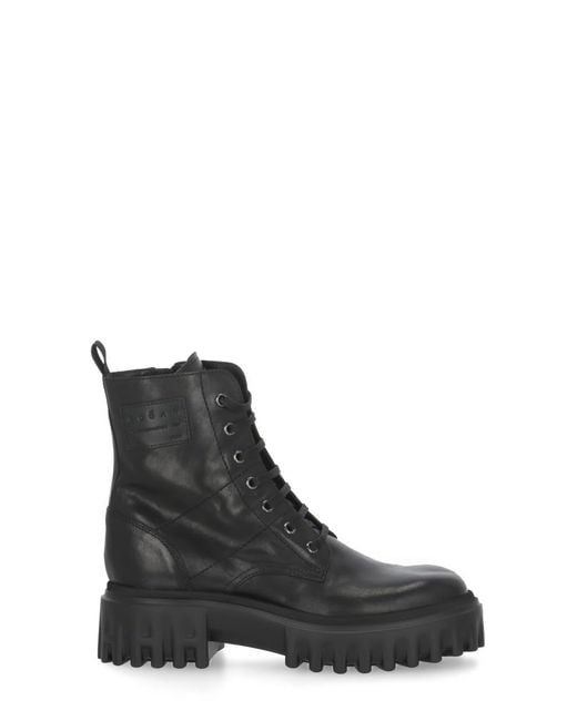 - Hogan black woman's leather boots - Round toe - Logoed tongue - Front laces fastening - Side zip fastening - Side logoed patch - Raised rubber sole (7,6 cm)Composition: 100% Cowhide Sole:, 100% Rubber Colour: black