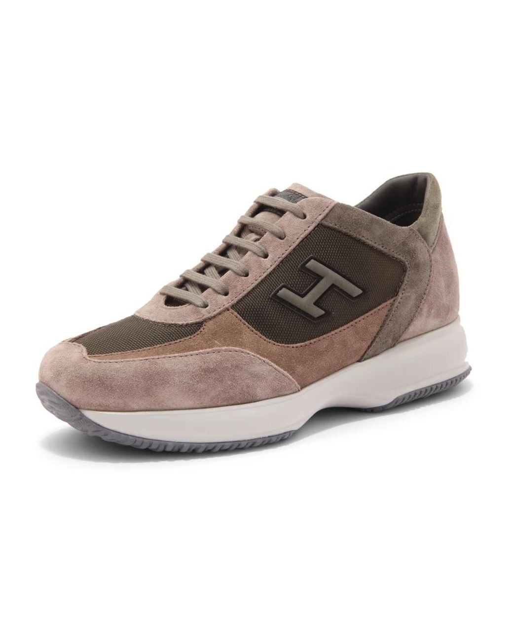 Hogan Interactive H Flock sneakers combine the brand’s signature flocked 'H' with a suede upper for a refined, everyday sneaker. Designed in Italy for comfortable, casual wear. Key attributes: Brown | Marrone | Tortora | Verde militare | Suede | Cushioned insole | Rubber sole | Lace-up closure | Removable insole | Flocked H logo on side | Perforated mesh inserts | Suede upper | Contrasting heel logo | Dimensions & fit: Total height: 5.7 cm | Wide fit | Composition & care: Suede | Fabric | Rubber