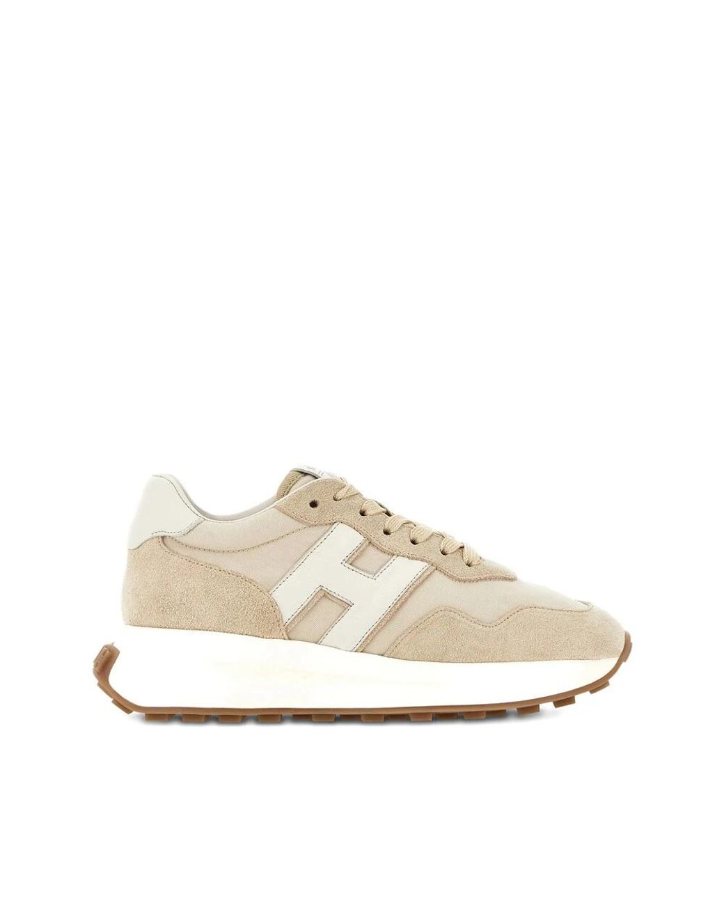 Hogan H641 Trainers combine a suede upper with leather and fabric detailing and a cushioned memory-foam footbed for everyday comfort. The design pairs a low-top silhouette with a grippy rubber outsole featuring H-shaped studs for reliable traction. Key attributes: Beige | Suede | Lace-up closure | Removable 8mm memory foam insole | Rubber outsole with H-shaped tread for grip | Low-top silhouette | Signature 'H' detail with outline on side | Round toe | Suede upper with leather and fabric detailing | Dimensions & fit: Sole height: 5 cm | Memory-foam insole: 8 mm | Regular fit | Composition & care: Suede upper | Leather details | Fabric inserts | Rubber sole | 8mm memory foam insole | Care and maintenance instructions included. Colour: natural