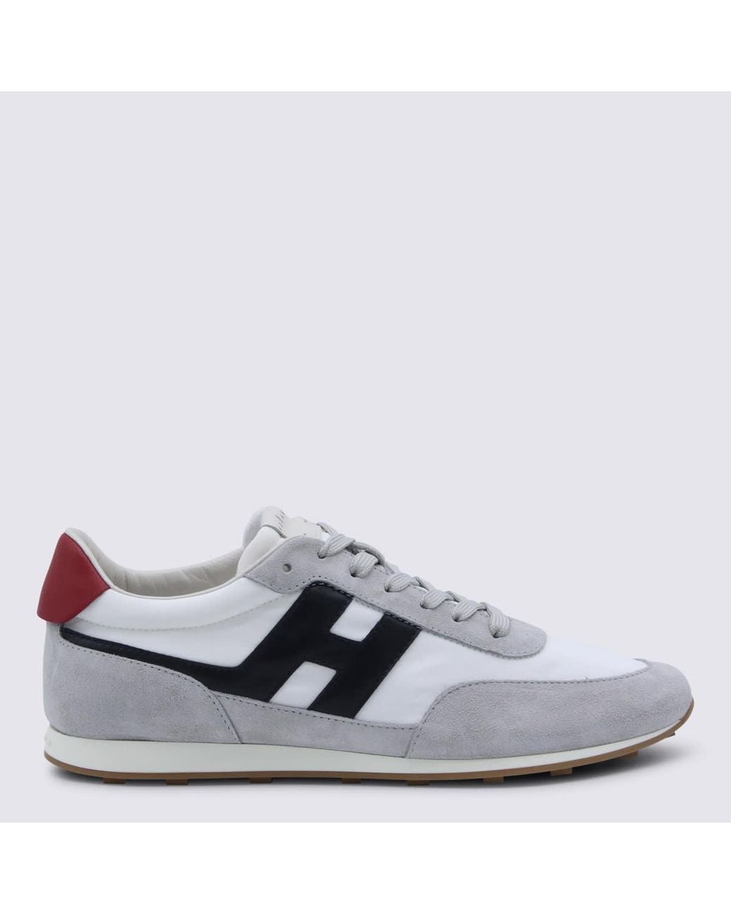 White sneakers from Hogan featuring black logo, round toe, laces fastening, red heel and comfortable fit.Composition: _cover Tex/le Sole, 100% Elastodiene