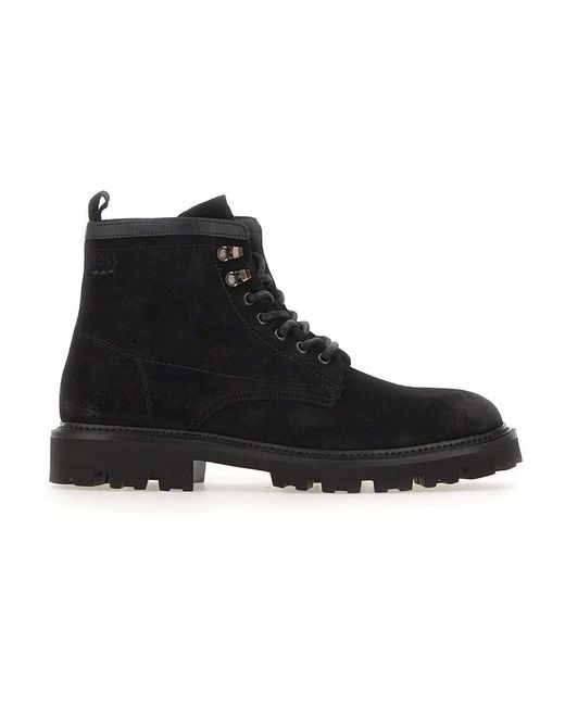 Boss Julyo Halb Boots pair suede leather uppers with a lugged rubber sole for stable, urban wear. Designed for everyday city use, they combine reinforced protection with easy on/off convenience. Key attributes: Black | Suede leather | Lugged rubber sole for enhanced grip | 4 cm heel for added stability | Lace-up closure with side zip | Reinforced toe cap | Strengthened heel counter | Fabric lining for comfort and easy maintenance | Rear pull tab | Above-ankle height | Embossed logo detail | Dimensions & fit: Above-ankle height | Regular fit | Composition & care: 100% cow hide leather | Sole: 100% rubber Colour: black