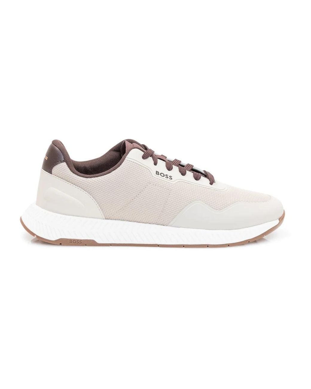 Hugo Titanium Runn brings a sporty, everyday trainer silhouette with a breathable mesh upper and a ribbed outsole designed for lightweight comfort and grip. Key attributes: Beige | Open beige | Polyester | Cushioning insole | Lightweight EVA sole | Breathable mesh upper | Lace-up fastening | Pull tab for easy entry | Fully lined | Ribbed outsole | Smooth trims | Side-panel logo detail | Composition & care: Upper: 100% Polyester | Lining: 100% Polyester | Insole: 100% Polyester | Sole: 70% Ethylene vinyl acetate, 30% Rubber | Wipe clean with a damp cloth or sponge. Colour: white