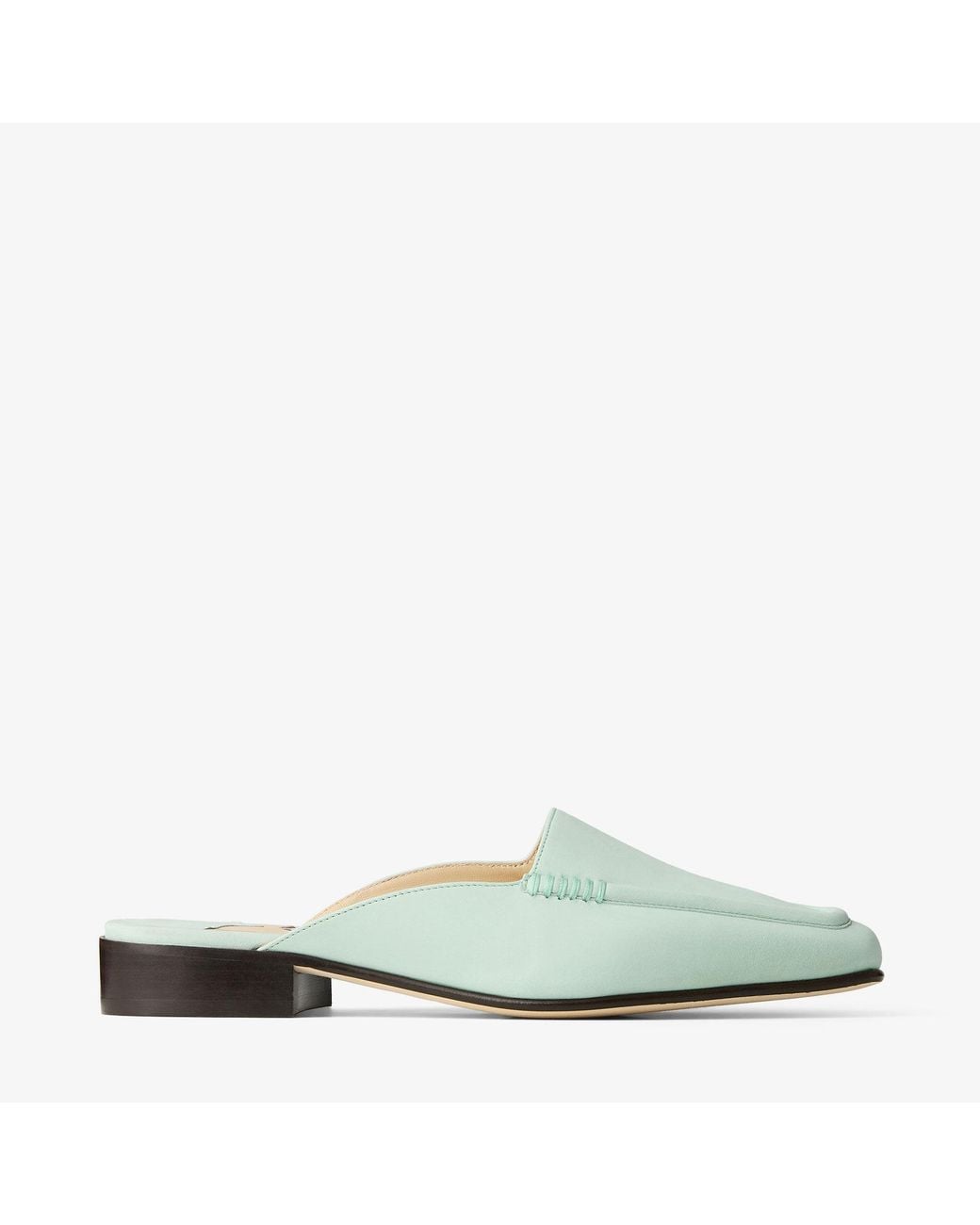 The Slide, originally debuted in 1999, reflected the changing notions of formal and casual, exploring the contradictions of effortless glamour. This contemporary mule is defined by a squared toe and crafted in mint nubuck. Colour: green