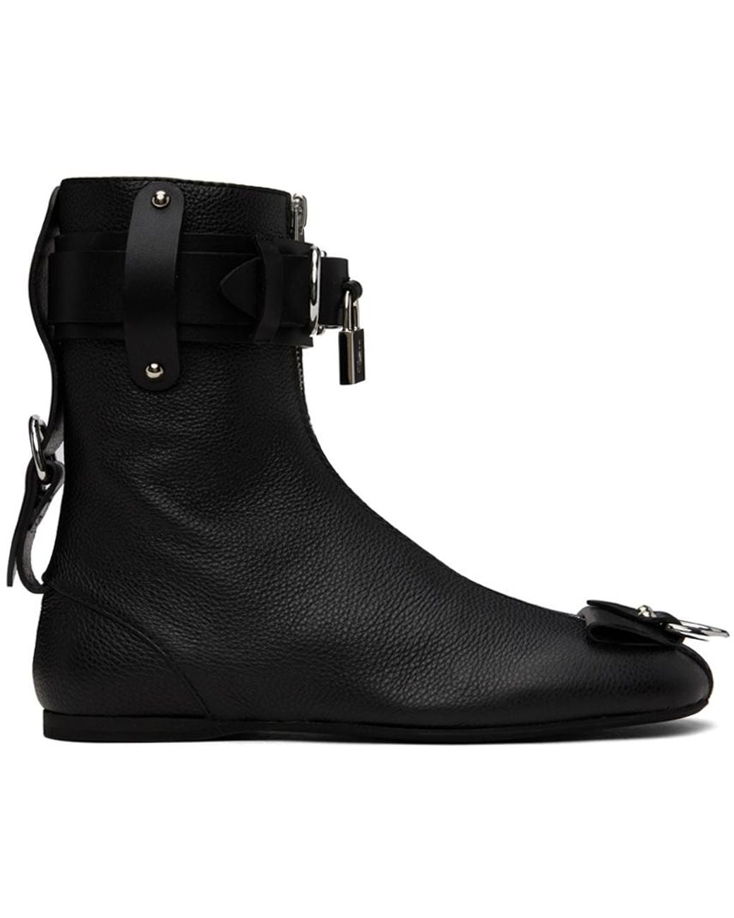 Ankle-high grained calfskin boots in black. D-rings throughout. · Zip closure · Pin-buckle ankle strap · Logo-engraved padlock hardware at collar · Pull-loop at heel tab and collar · Strap at heel counter · Grained sheepskin lining · Rubber sole · Silver-tone hardware Supplier color: Black