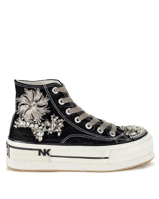 With Coppola, a vintage, basketball style shoe is elevated to another level with an inch high platform sole, distressed by hand with silver, metallic paint. The canvas body is also lightly distressed with a metallic effect for that sought after 'worn in' look. The outer side of the trainers are heavily embellished with a selection of crystal and diamanté appliqués. The laces are silver metallic, woven to look like chain mail. *These fabulous trainers are smothered in stones, crystals and beads. We have to be very honest and point out that although these adornments are very well secured it would not be unusual for you to lose some of them, especially in high use, pinch point areas like the laces or the tongue. Uppers - 100% Textile Lining - 100% Textile Sole - Rubber Wipe dirt off with a damp cloth. Colour: black