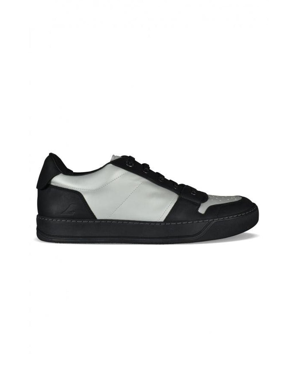 Lanvin DBB1 sneakers in black and metallic gray leather. L logo embossed on the outside. Black rubber sole. Black laces. Rounded toe.