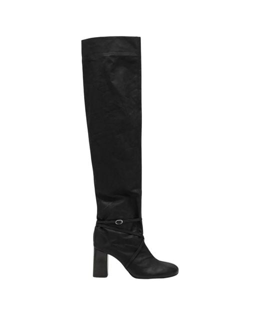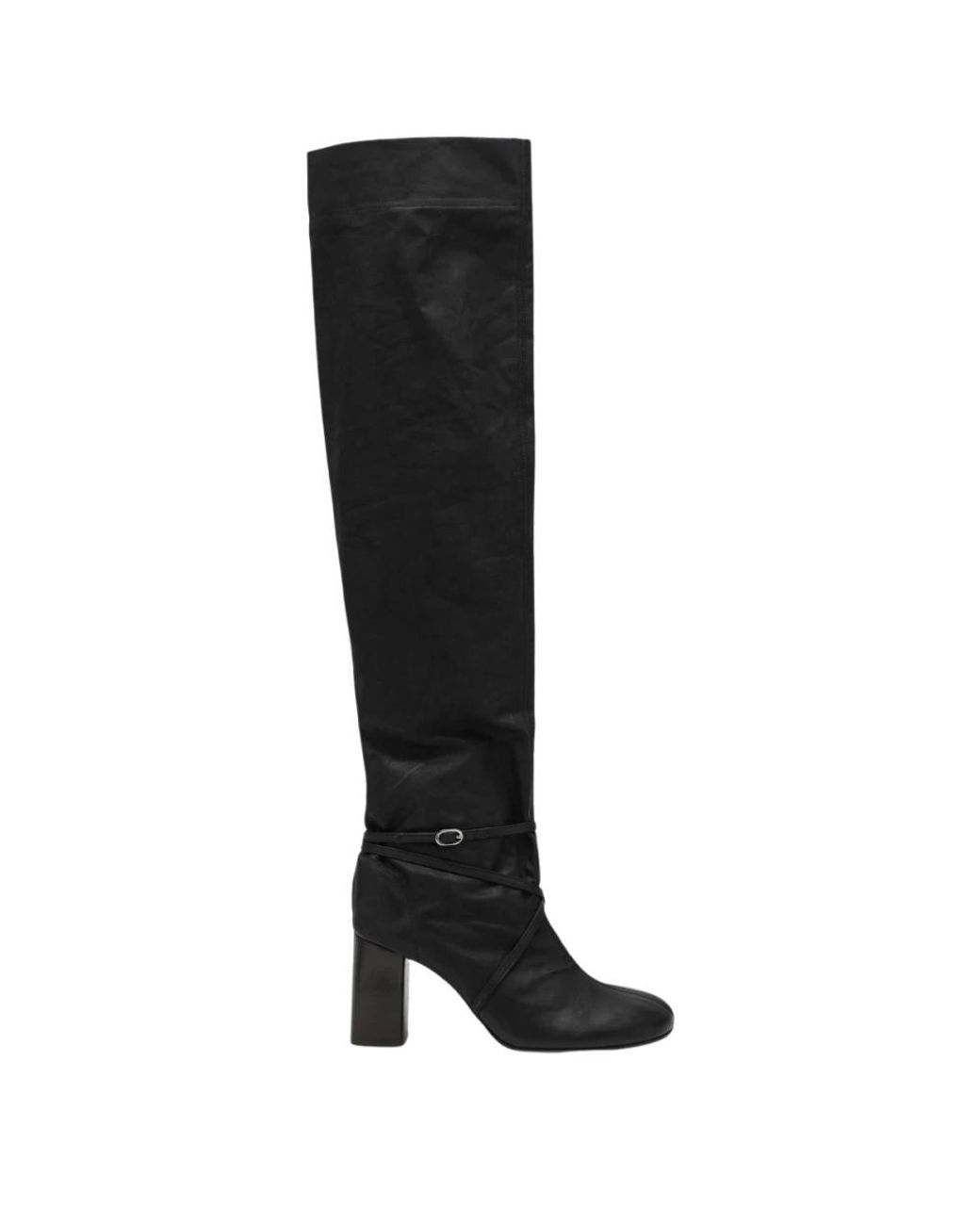 Lemaire Knotted Anatomic High Boots 80 merge an ergonomic anatomic shape with a sculpted block heel for elevated everyday wear. The design pairs a water-repellent resinated cotton canvas upper with a knotted ankle strap for a refined, wearable silhouette. Key attributes: Black | Onyx | Cotton | Water-repellent | Adjustable ankle strap with metal buckle | Slip-on design | Round/anatomic toe | Knotted/tone-on-tone ankle strap | Column/block heel | Slip-on construction with braided crossover strap detail | Dimensions & fit: Heel height: 8 cm | Composition & care: 100% cotton | 100% lamb leather | If exposed to water or high humidity, dry shoes with an absorbent cloth and let air dry before storing. Brush lightly with a soft brush to avoid damaging textile fibres. Colour: black