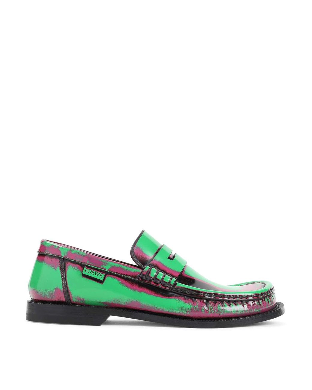 Loewe campo brushed green and pink loafers crafted from green and pink brushed iconic asymmetric round toe top penny strap piping hand, stitching branded in and out Colour: green