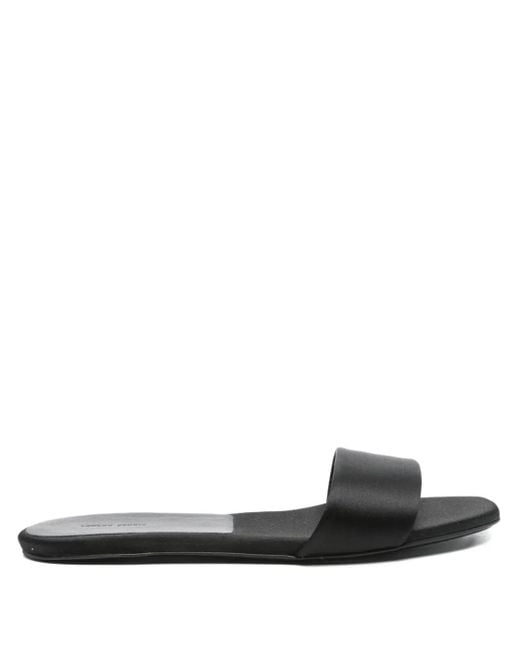 Black satin effect single band flat sole open toe slip-on style Size: 38. Gender: Female. Material:Fabric/Calf Leather/Fabric/Calf Leather/Calf Leather. Colour: black