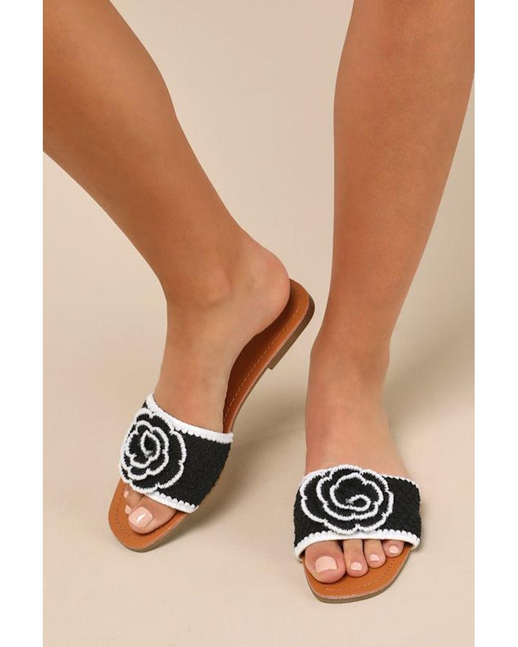 Effortless styling is essential on vacation, which is why these simply cute slide sandals and a couple of sundresses should definitely be in your carry-on. Black and white-hued crochet knit shapes a wide vamp with a sweet flower motif atop the open-toe silhouette, creating a Boho-chic design everyone will adore. Man Made Materials. Imported. Lulus | Simmy Black and White Flower Slide Sandals | Size 9. Colour: black