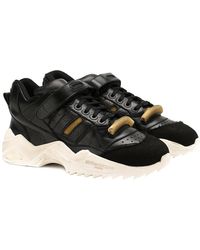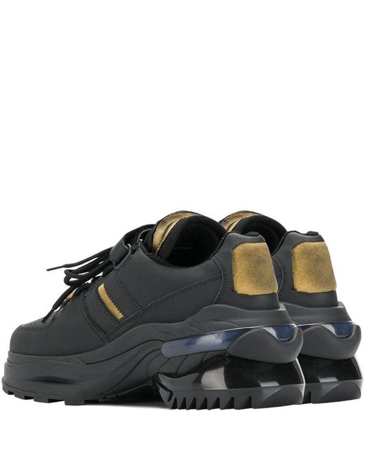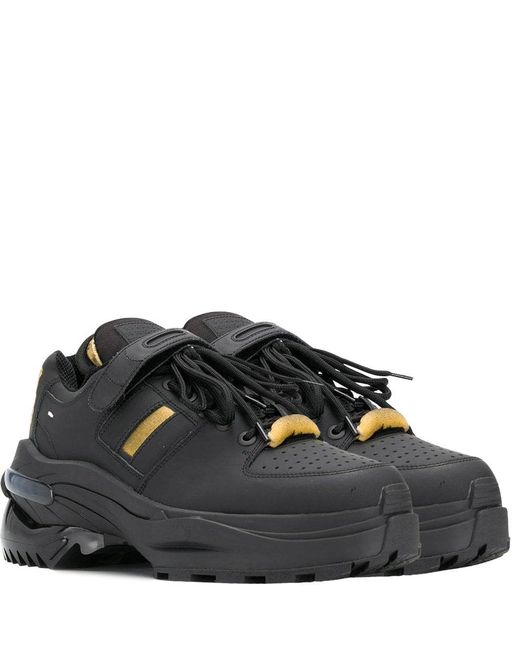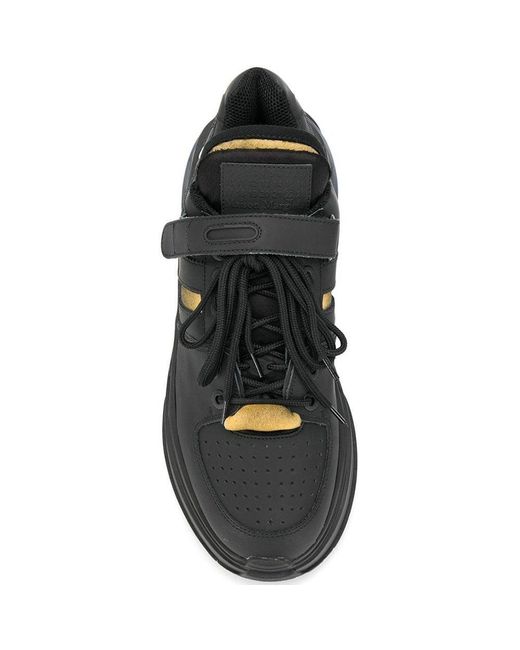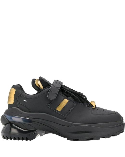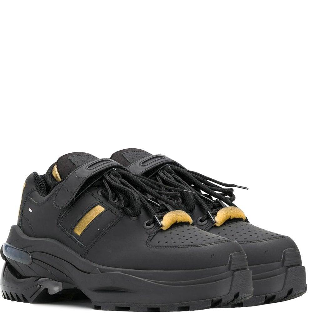 Black lace-up sneakers from Maison Margiela. Made of leather with time-worn effects. Enriched by beige sponge inserts as well as perforation. Also feature velcro closure and black sole made of rubber. Outer Layer: Leather. Inner Layer: Leather. Fabric. Sole: Rubber. Platform Height: 4cm.