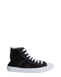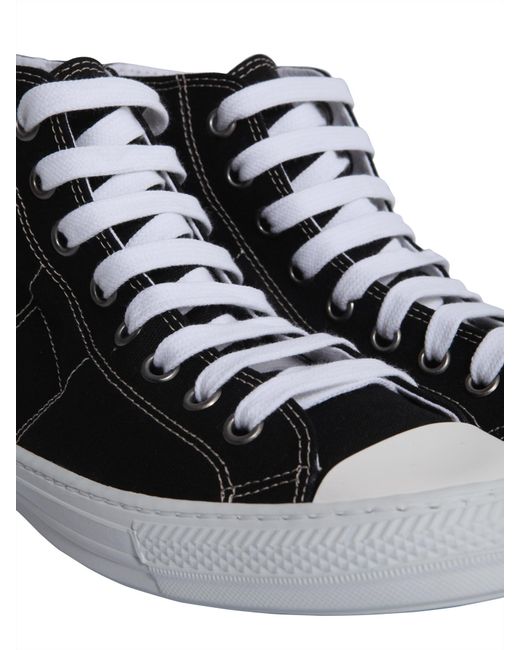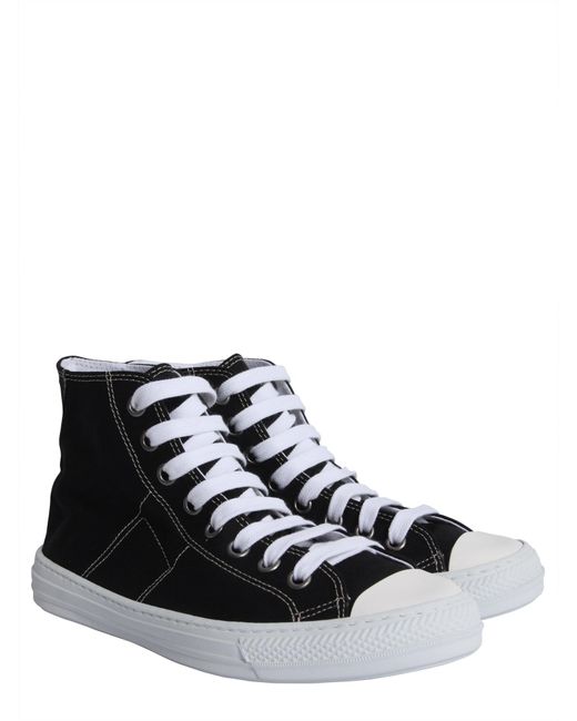Rubber sole: 2 cm. Lace up closure. Reinforced metal eyelets. Rubber toe cap. Side logo lettering. Contrast stitchings. Canvas insole and lining. 100% canvas. Made in italy. Colour: black