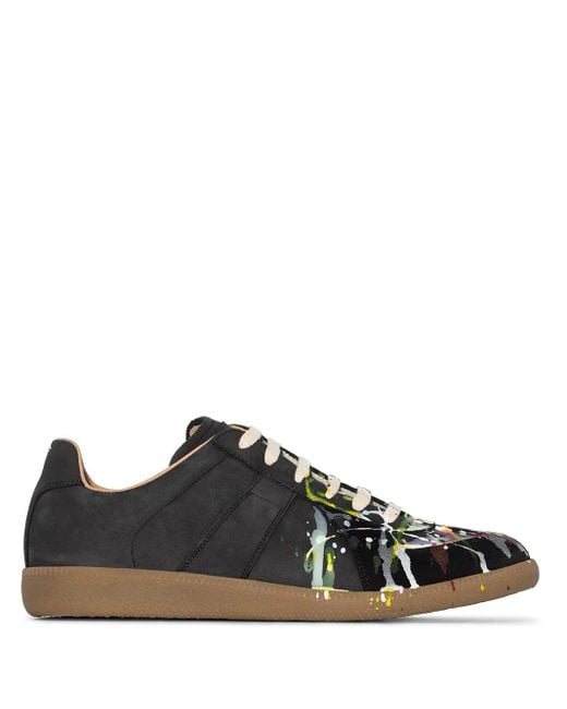 These black Maison Margiela Replica paint splatter leather sneakers feature rubber soles, lace-up fronts, logo tongues, leather uppers, stitching details on the sides and multicoloured paint splatter detailing at the front. Whilst imitation might be a form of flattery, there is no Replica for these Maison Margiela trainers. Size: 40.5. Gender: Male. Material:Lamb Skin/Lamb Skin/Rubber.