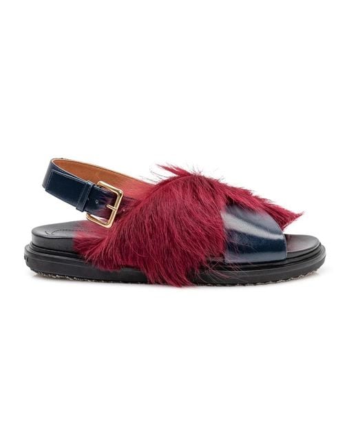 Marni Fussbett Sandal blends an iconic crisscross silhouette with mixed smooth and long-hair leather for a contemporary, sculptural look. Designed for everyday wear, it pairs an anatomical insole with a non-slip outsole for stable comfort. Key attributes: Blue | Camelia | Leather | Anatomical leather insole | Non-slip rubber outsole | Adjustable buckle strap | Crisscross strap design | Two-tone construction | Raised branding on heel | Contemporary silhouette | Composition & care: Upper: 100% Ovine Leather | Contrast: 100% Calf Hair | Lining: 100% Calf Leather | Inside: 100% Ovine Leather | Sole: 100% Rubber Colour: red