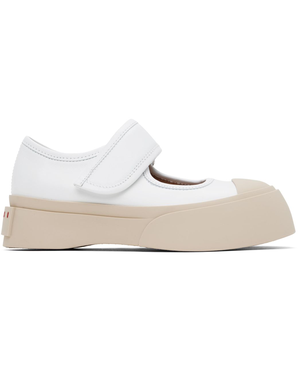 Buffed calfskin Mary Jane-style ballerina flats in white. · Round rubber cap toe · Velcro strap at vamp · Metal eyelet vents at inner side · Logo embossed at padded leather footbed · Buffed leather and suede lining · Logo embossed at platform rubber midsole · Treaded rubber outsole · Platform: H1.75 in Supplier color: Lily white