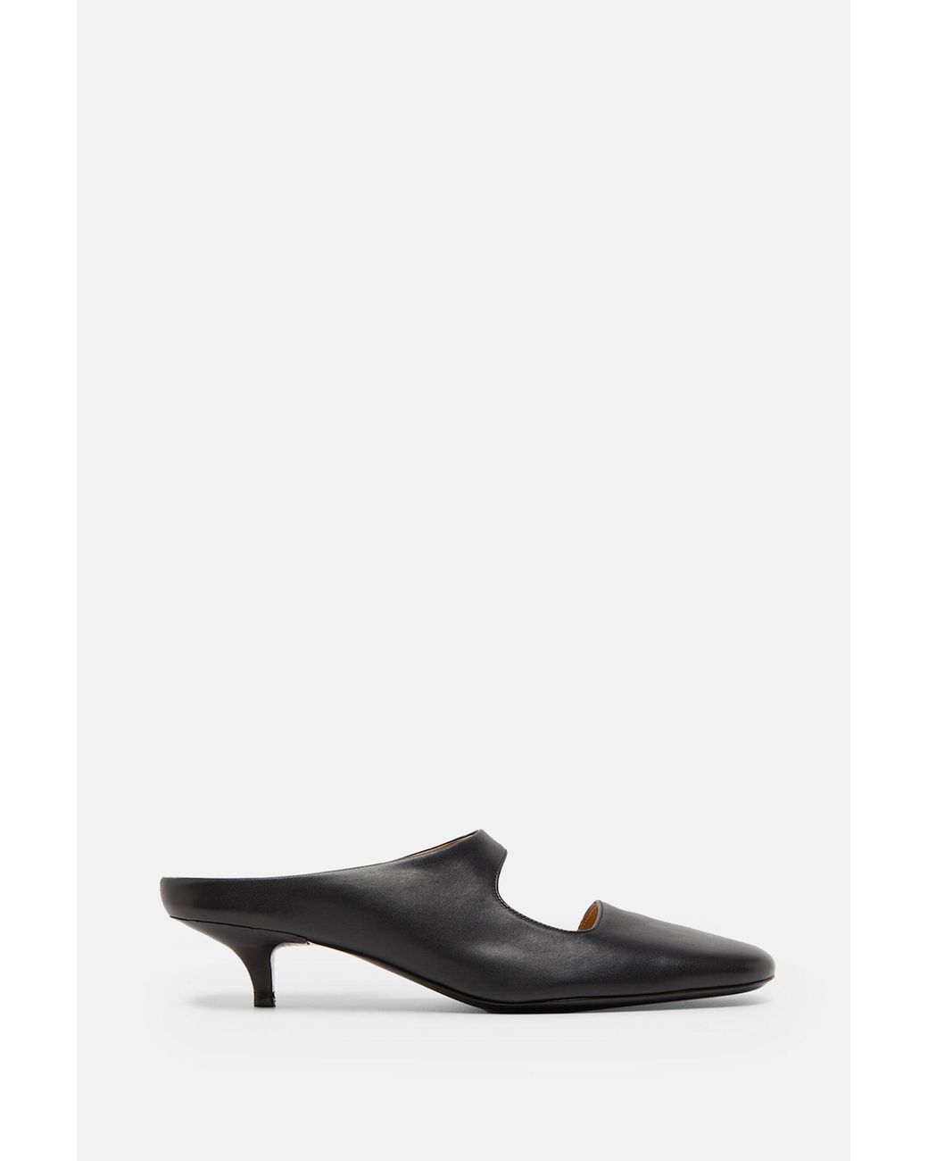 Spianata mules made from smooth, shiny black leather. Tapered toe design. Visible cut-out detail above the heel. Strap across the instep. Composition: 100% Calf Leather Colour: black