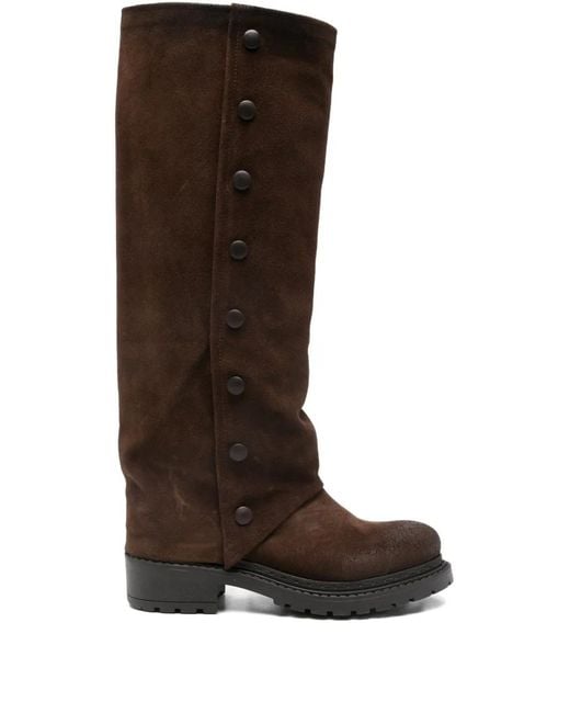 Brown button detailing lug sole round toe low block heel pull-on style Size: 37. Gender: Female. Material:Calf Suede/Calf Leather/Rubber.
