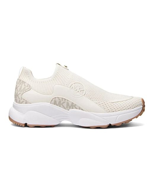 Step out in style with our Michael Kors Sami trainers for women. These sporty slip-on trainers feature a front zip for convenience and a touch of flair. Crafted from breathable stretch knit with sleek finishes and a logo print, they offer both comfort and style. The rubber sole provides cushioned support, while the logo print trims tie the look together seamlessly. Perfect for on-the-go fashionistas. Imported. Style 43S5Smfs 1D. Colour: white