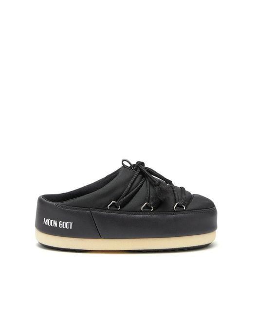 Stay stylish and comfortable with these Moon Boot men's mules. Featuring a black logo print on the side, round toe front, lace-up fastening, slip-on style, branded insole, and flat rubber sole. Made of 100.0% Other Fibres. Colour: black
