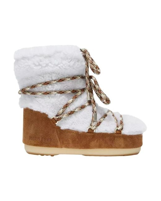 Stay stylish and warm this winter with the Full Moon Shearling Boots by Moon Boot. Crafted from white-brown suede with a cosy white trim, these boots are perfect for snowy adventures. Key attributes: Whisky | Off White | Suede | Water-repellent finish | Drawstring fastening | Lace closure with hooks | Padded design | Rounded toes | Rubber insulating sole | Colour: white
