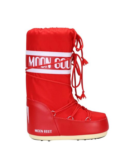 Moon Boot Icon Nylon Boots are a high-cut winter boot designed for cold, wet conditions. The style pairs insulated, water-repellent nylon uppers with a grippy rubber tread for reliable warmth and traction in snow and slush. Key attributes: Red | Nylon | Water-repellent | Insulated | Non-slip rubber tread sole | Drawstring at shaft for adjustable opening | Slip-on, ambidextrous design (no distinct left/right) | Multisize foam lining for adaptive comfort | Criss-cross tubular laces (aesthetic) | PVC heel counter and trim | Thermoplastic midsole | High-cut, astronaut-inspired silhouette | Logo-print panel | Silver-tone metal eyelets | Dimensions & fit: Adaptable fit — multisize foam lining molds to the foot for a secure, comfortable feel. | Composition & care: Nylon upper | PVC heel counter and trim | Thermoplastic midsole | Rubber outsole | Foam lining
