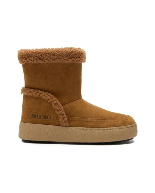 Moon Boot Ltrack Tina Boots pair a suede upper with plush shearling trim for warm, casual winter wear. The slip-on design and lightweight rubber sole deliver easy on/off comfort for everyday cold‑weather use. Key attributes: Brown | Suede | Lightweight rubber sole | Flexible midsole | Durable thermoplastic rubber tread | Slip-on / pull-on style | Thermoplastic midsole | Thermoplastic rubber tread sole | Suede upper | Shearling trim | Round toe | Flat sole | Embossed logo on side | Branded heel counter | Dimensions & fit: If between sizes, we recommend taking one size up. | Composition & care: Upper: 90% cow suede, 10% sheep leather | Lining: 63% sheep leather, 27% polyester, 10% polyamide | Sole: 100% thermoplastic rubber | Use a soft, dry brush to remove dirt. Clean suede gently with a soft, damp cloth and mild detergent; do not immerse in water. Allow to air dry at room temperature. Avoid spray-on waterproofing treatments. Colour: brown