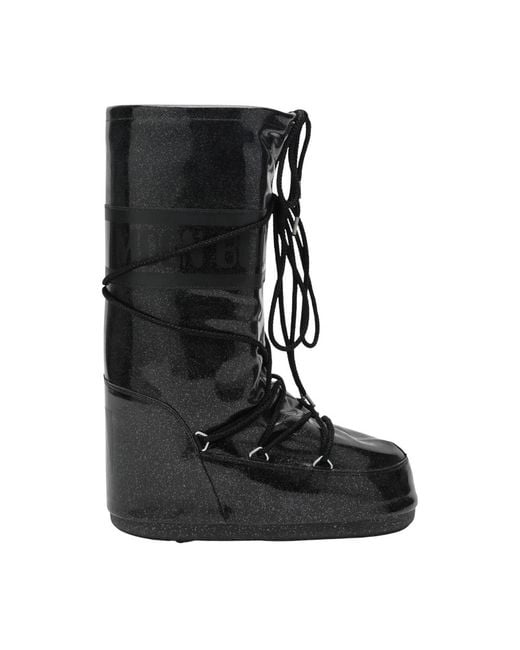 Moon Boot MB Icon Glitter Boot pairs an insulated, padded silhouette with a glitter-finish upper for standout winter wear. Built for snow and cold-weather use, it combines secure lacing and a reinforced heel with a grippy rubber sole. Key attributes: Black | Synthetic, Textile | Insulated | Durable rubber sole | Adjustable lacing | Reinforced heel counter | Ambidextrous design (no left/right distinction) | High shaft | Glitter finish | Round toe | Composition & care: Upper: Synthetic | Lining: Textile | Sole: Synthetic Colour: black