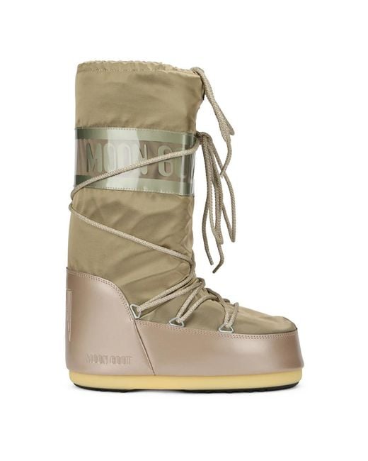 Moon Boot Icon Glance Boot updates the brand’s signature padded silhouette with a nylon finish and technical details. Built for cold, wet conditions, it pairs an insulating foam lining with a slip-resistant sole for secure, comfortable wear. Key attributes: Beige | Nylon | 100% water-repellent | Insulating lining for warmth | Slip-resistant rubber tread sole | Lightweight thermoplastic midsole | Slip-on design with decorative laces | Drawstring at top | Multisize foam lining that molds to the foot | Cylindrical padded silhouette | Logo-print panel | PVC heel counter and trim | Criss-cross tubular laces | Dimensions & fit: Multisize foam lining adapts to different foot shapes | If between two sizes, choose the larger size | Lightly relaxes after a few hours of wear for a molded fit | Composition & care: Upper: 35% Polyamide, 35% Polyester, 30% PVC | Trims: 100% PVC | Lining: 100% Polyester | Mid sole: 100% Thermoplastic rubber | Sole: 100% Rubber | Remove dirt with a soft, dry brush. Wipe marks with a soft, damp cloth and mild detergent. Clean midsole and outsole with a soft brush, mild detergent and water. Allow to dry at room temperature. Colour: natural