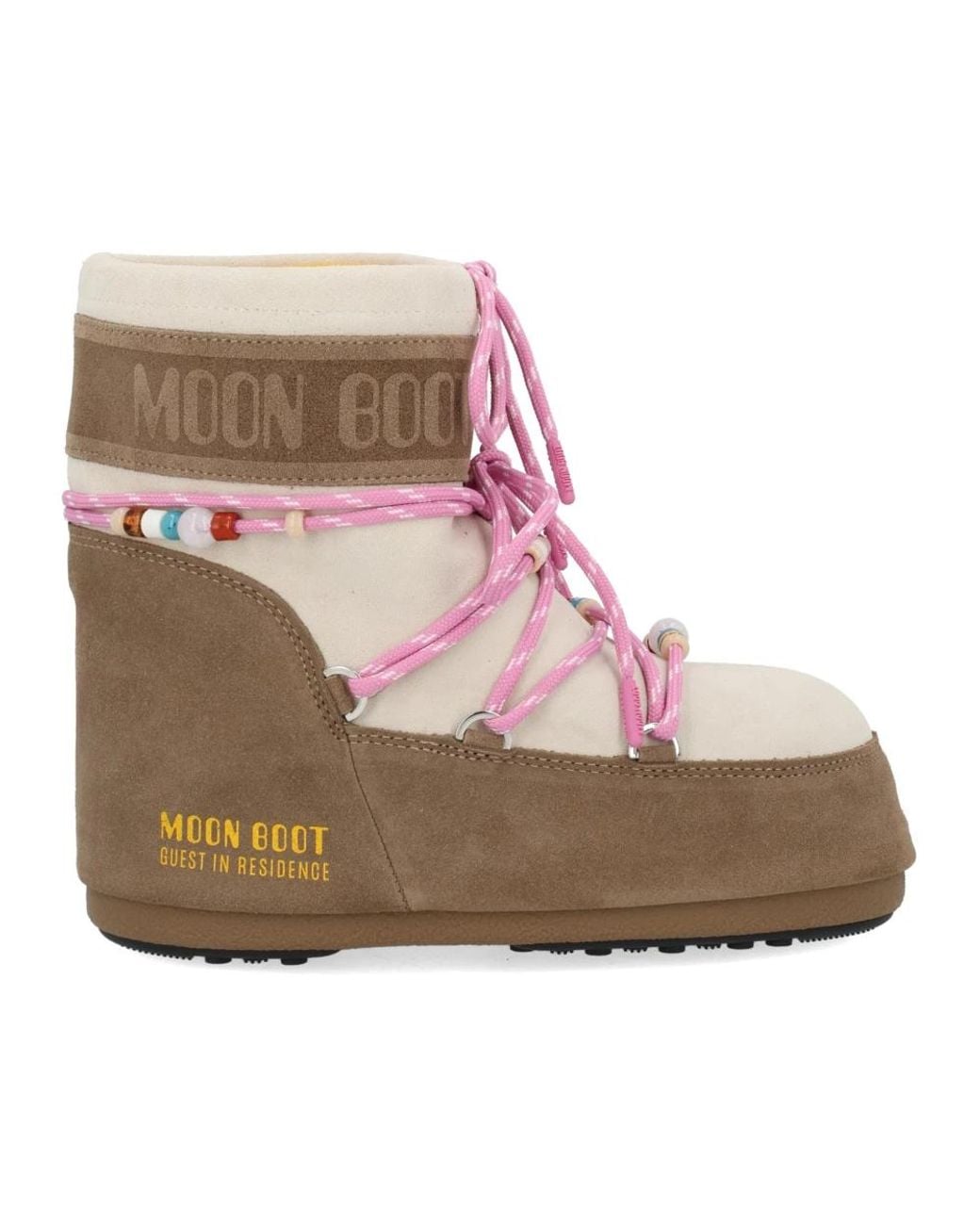Moon Boot Icon Low Suede Beads reinterprets the brand’s signature silhouette with color-block suede panels and multicolour beaded laces. Designed for après-ski style and cold-weather wear, it pairs a low-top profile with a warm, padded lining and grippy rubber sole. Key attributes: Multicolour | Multicolour | Suede | Thermoplastic midsole | Slip-resistant rubber tread | Padded foam lining for warmth | Beaded tubular laces | Metal eyelets | Slip-on / low ankle design | Low-top silhouette | Color-block suede panels | Contrasting tubular laces with multicolour beads | Signature collaboration logo (Guest in Residence) | Dimensions & fit: Multi-size fit — sold in paired ranges (e.g., 36/38, 39/41) | Composition & care: Outsole: 100% rubber Colour: pink