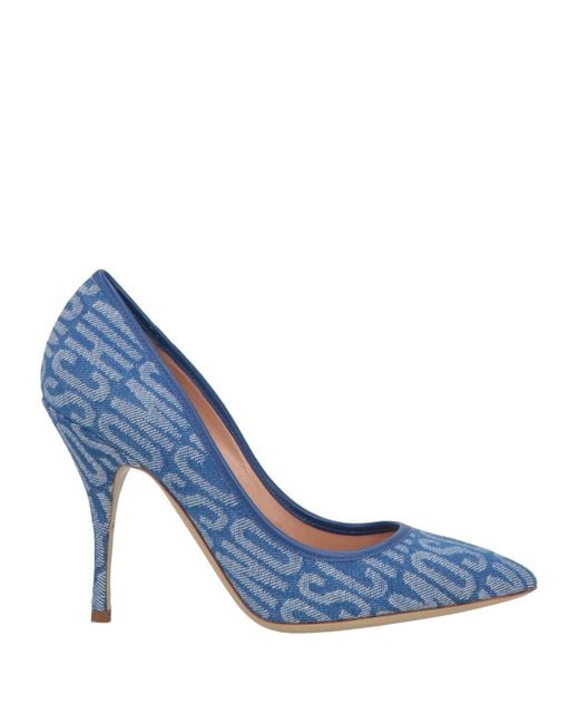MOSCHINO. stilettos, denim, logo-print, leather trims, leather lining, pointed toe, spike heel, covered heel, leather sole, contains non-textile parts of animal origin. Textile fibres. Colour: blue