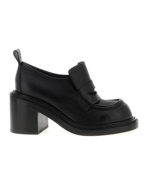 Moschino Olivia Heeled Loafers refresh the classic university loafer with a sculptural geometric heel and a reinforced two-layer sole. The design balances structured polish with everyday stability for tailored or smart-casual wardrobes. Key attributes: Black | Calfskin | Sturdy construction | Supportive heel | Rear loop for easier fitting | Stable, supportive sole | Leather lining | University loafer silhouette | Geometric high heel | Two-layer construction with double welt | Penny mask detail | Composition & care: Upper: 100% Calfskin | Lining: 100% Goatskin | Bottom/Sole: 100% Calfskin Colour: black