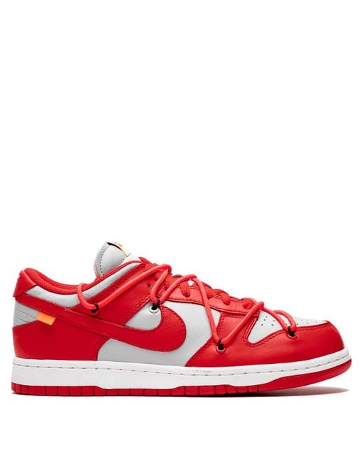 The Off-White x Nike Dunk Low “University Red” is Virgil Abloh’s rendition of the early-aughts classic Dunk design. The highly anticipated collaboration between Off-White and Nike on the Dunk comes on the heels of a string of high-profile releases between the two brands. The upper features a light grey leather base on the mid-panel, toe, and ankle collar. Contrasting University Red leather overlays appear on the forefoot, toe, lateral panel, ankle collar, and heel. Standard-issue red laces are present, and then Abloh adds his own lacing system as staggered bold orange laces cover parts of the entire upper. Putting the finishing touches on the design is a white rubber sole with a red outsole. Release date: October 2019. Size: 4. Gender: Unisex. Material:Other fibres. Colour: red