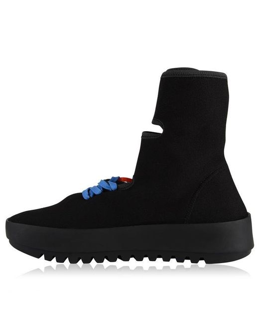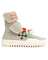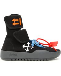 Always pushing the boundaries of what is expected of streetwear, Off White c/o Virgil Abloh's shoe offerings are always head turners, and the Motowrap sneakers are no exception. Sporting the brand's iconic arrow to the side, they feature textile construction with an extra high topline, fastened at the ankle with two straps for a silhouette that is simultaneously chunky and slim. Off White c/o Virgil Abloh super high top trainersStrap fasteningRound toe, 4 way arrow printed to the side, contrasting laces, plastic tap detail, chunky soleSynthetic upper, synthetic lining, rubber soleMade in Italy.
